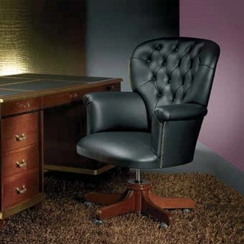 Рабочее кресло выполнено в классическом стиле. Обтянуто кожей. Декорировано мебельными гвоздиками и стежкой капитоне. Оснащено механизмом регулировки положения сиденья.