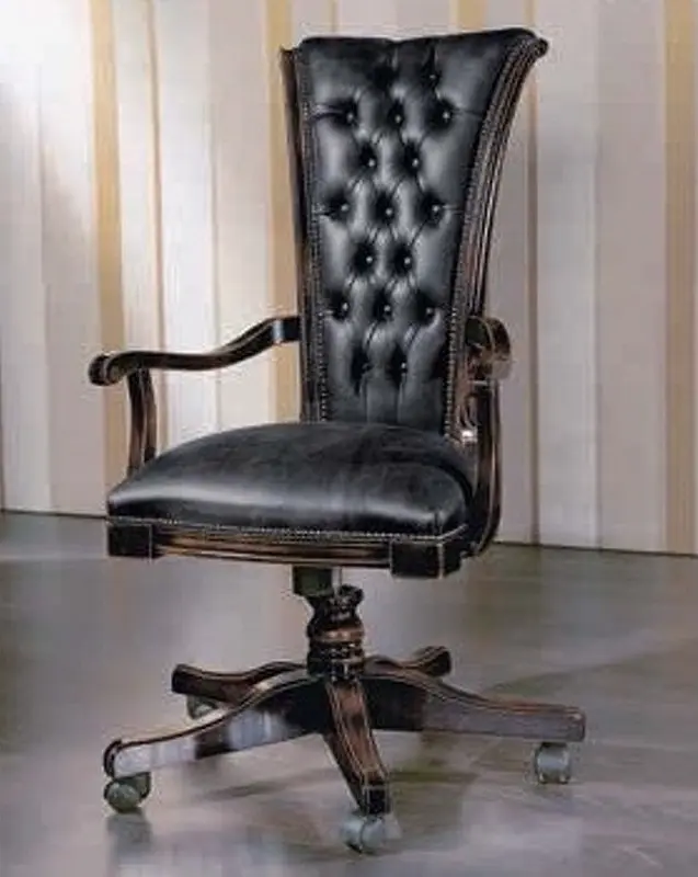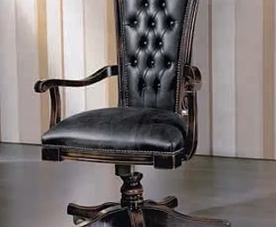Рабочее кресло выполнено в классическом стиле. Сиденье и узкая спинка обтянуты кожей. Декорировано мебельными гвоздиками и стежкой капитоне. Оснащено механизмом регулировки положения сиденья.