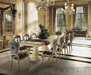 Раздвижной прямоугольный стол Opera. Классический стол для столовой Opera сделан итальянскими мастерами и дизайнерами в классическом стиле, и выполнен в нежном цвете слоновой кости с добавлением позолоченной фольги, что придает помещению дополнительное визуальное пространство. Классический стол сделан из высококачественного массива и дополнен шпоном. Стильный и элегантный стол дополнит любой самый изысканный интерьер вашего дома.