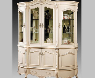 Итальянский стиль и исполнение из МДФ белоснежного оттенка. Четырехдверный с закрытыми полками и открытыми, верх защищен стеклянными дверями. Фурнитура серебряного цвета и цветочный декор из ППУ с росписью на фасадах, выполненной вручную.