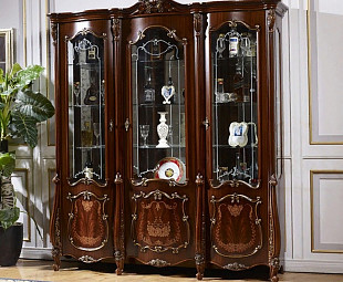 Имеет три стеклянные дверцы и полки для предметов интерьера.