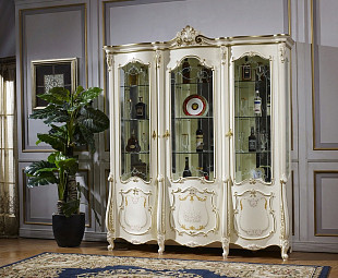 Изготовлен из МДФ в цвете "Слоновая кость". Имеет три стеклянных дверцы, за которыми скрываются прозрачные полки. Фасады глянцевые, задекорированы ручной росписью с цветочным орнаментом, дополнительно украшена объемными элементами из ППУ с позолотой.