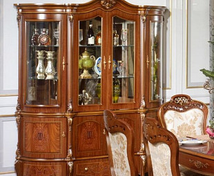 Теплый цвет "Орех", материал изготовления - МДФ, фасады глянцевые с имитацией структуры дерева. Четыре распашных стеклянных дверцы скрывающих ниши с полками, снизу расположен выдвижной ящик. Декорирован элементами из ППУ с позолотой и роскошной короной сверху.