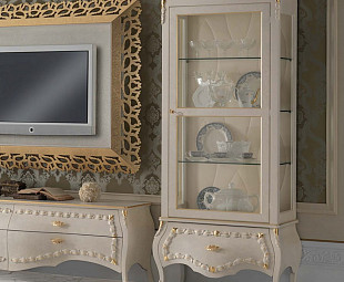 Элегантный сервант La Belle Epoque с одной стеклянной створкой выполнен из массива дерева в отделке шпоном ореха. Модель с классическими округлыми формами, изогнутыми ножками и великолепным резным декором, частично покрытым золотым напылением. Сервант оснащен выдвижным ящиком с фигурной ручкой, а также несколькими стеклянными полками для хранения дизайнерской посуды или иных стильных аксессуаров.