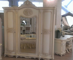 Шкаф 4 дверный Элина представляет собой классическую модель, выполненную в красивых оттенках бежевого цвета. Фасад украшают резные вставки флористической тематики, зеркальные дверцы по центру и две боковые имеют металлические ручки. Нижний край художественно оформлен фигурной линией.