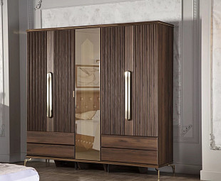 5-дверный платяной шкаф Montego также выполнен из высококачественного лдсп. В центре шкафа расположена зеркальная дверь с рисунком, а боковые отделения представлены распашными дверями. Внутри шкафа три отделения, где центральное отделение оснащено полками, а левое и правое отделения имеют штанги для вешалок и полки с выдвижной вешалкой для аксессуаров. Двери и ящики оснащены механизмами плавного закрывания.