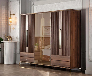 Шкаф для одежды с шестью дверцами из серии Montego обладает уникальной конструкцией, которая обеспечивает функциональность и стиль в вашей гостиной или спальне. Центральные двери оснащены зеркалами с элегантным рисунком, а боковые двери дополнены бронзовыми ручками, придавая шкафу особый шарм. Внутреннее наполнение включает три отделения: центральное отделение с широкой полкой сверху и комбинированными полками и штангой, левое отделение со штангой для вешалок, полкой и выдвижной вешалкой для аксессуаров, а правое отделение с полкой и штангой сверху. Этот шкаф идеально сочетает в себе функциональность и эстетику, предоставляя максимум удобства для хранения одежды и аксессуаров.