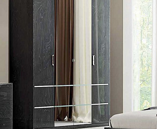 Шкаф четырехдверный в спальню Далила с распашными дверцами имеет полки для вещей и отделение со штангой для вешалок. Изготовлен из темно-серого МДФ с лакированными фасадами, с рисунком, имитирующим структуру дерева. Посередине расположены две двери с зеркалами.