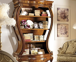 Шпон ореха, инкрустация из клёна и груши, злотая или серебряная фольга, резьба ручной работы, патинирование, лак.