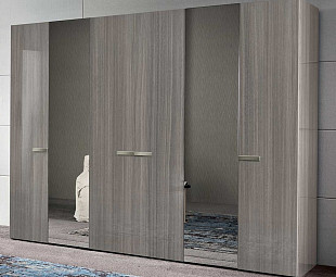 Большой шестисекционный шкаф Iris – модель с особым характером. Обладая огромной вместительностью и прекрасно внутренне обустроенный, гардероб шикарно впишется в интерьер просторной спальни или гостиной. Глянцевые фасады с сохраненной фактурой дерева выглядят дорого и нарядно, а кроме того, визуально увеличивают пространство. Довершают образ лаконичная фурнитура и зеркальные створки.