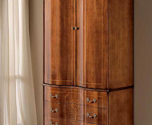 Шкаф для одежды из массива узкий Classic Alonzo, модульной конструкции. В верхнюю часть с двумя створками можно разместить одежду на вешалках. Нижняя часть состоит из трёх выдвижных ящиков, в которых возможно аккуратно разложить белье и иные необходимые вещи. Шкаф-комод удобен и вместителен, однако не будет загромождать пространство Вашей спальни. Лаконичен и изящен.