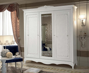 Большой классический шкаф для одежды La Belle Epoque с тремя распашными створками - стильный и функциональный предмет интерьера. Гардероб, изготовленный из цельного дерева, украшен искусной резьбой и роскошным рельефным декором. На центральной створке имеется большое зеркало с напылением. Вместительное внутреннее пространство оснащено полками, штангами для вешалок, а также встроенным модулем с выдвижными ящиками. Некоторые элементы изделия покрыты сусальным серебром.