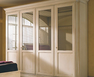Большой и вместительный гардероб Margot отличается яркой харизмой при довольно скупом стилевом оформлении, присущем эпохе позднего классицизма. Из элементов декора – лишь аскетичная фурнитура и выполненные вручную фигурные элементы. Эстетика высокого стиля обыграна четкостью линий, смягченных теплом благородных оттенков. Шкаф оснащен четырьмя створками, каждая из которых украшена рельефным стеклом. Внутреннее пространство обусловлено просторными отсеками с рационально продуманным наполнением, состоящим из полок, штанги для вешалок и ящиков для белья.