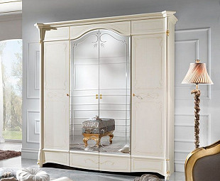 Шкаф для одежды распашной Diamante выполнен в классическом стиле с лаконичностью и изящностью линий, присущих итальянским дизайнерам. Изготовлен из массива дерева белоснежного оттенка, имеет четыре распашные дверцы, две из них с зеркальной поверхностью. Декорирован росписью и резьбой с позолотой.