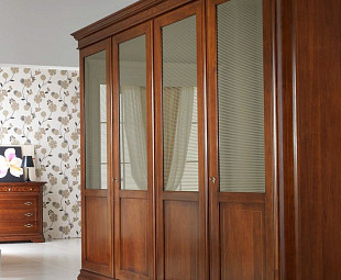 Изысканный шкаф Margot – это строгий элегантный дизайн и солидный функционал. Изделие выполнено из ценных пород древесины в духе современного классицизма. Модели этого стиля отличаются классической статью с дорогим внешним видом и выверенными пропорциями. Но при этом не гнушаются четкостью линий и простотой оформления. Шкаф оснащен четырьмя створками, каждая из которых украшена рельефным стеклом. Внутреннее пространство обусловлено просторными отсеками с рационально продуманным наполнением, состоящим из полок, штанги для вешалок и ящиков для белья.