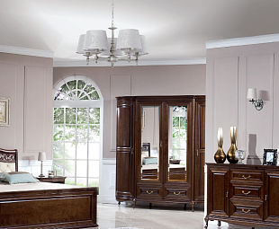 Шкаф для одежды в спальню Verona Taranko производится из массива натурального и выпускается в двух цветах braz и krem patina. Шкаф сочетает в себе сразу несколько полезных функций. Верхние отделы закрыты распашными дверями, и предназначаются для хранения одежды и белья. Для небольших вещей внизу предусмотрительно сделаны два выдвижных ящика, снабженных мягкими доводчиками. Центральные двери дополнены большими зеркала в полный рост, что увеличивает функциональную ценность мебели.