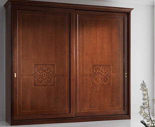 Изысканный шкаф-купе Margot – блестящий вариант для просторной спальни или гардеробной. Модель выполнена из ценных пород древесины в неоклассическом стиле и в обработке итальянскими мастерами являет собой уникальный предмет интерьера. Он с первых минут дает представление об уровне качества и культуре мебельного ремесла. Створки шкафа закрыты глухим полотном, насыщенным фактурными ароматами дерева. Особых слов заслуживает фасад, где все внимание обращено к великолепию украшающих его инкрустаций.
