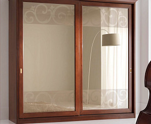 Стильный шкаф-купе Margot обладает классической эстетичностью и просторным, рационально спланированным внутренним наполнением. Это многогранное сочетание обусловлено тенденциями позднего классицизма, в стиле которого выполнен гардероб. Надежный, добротный корпус из цельного дерева и огромные зеркала – вот главные преимущества универсальной модели, подходящей для интерьера спальни или прихожей. Изделие украшено причудливой росписью с растительными мотивами и минималистичными ручками. Внутри имеется множество полок, штанга для вешалок и ящики для белья.