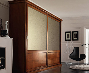 Шкаф-купе в спальню вишня Riva – классическая модель от итальянской фирмы Mario Villanova, незаменимый предмет обстановки спальни. Большой, вместительный и представительный, с двумя раздвижными дверцами на роликовом механизме. Патинированный фасад в верхней части оформлен матовыми стеклами серебристого оттенка в технике кракелюр.