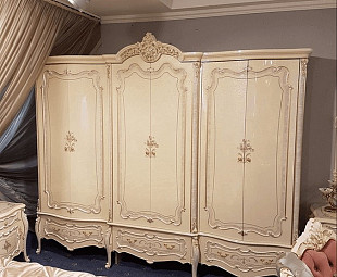Изготовлен из МДФ в благородном цвете "Слоновая кость". Верх украшн резной короной с вензелями, основание закреплено на восьми изогнутых ножках с резьбой, покрытой позолотой. На глянцевые фасады распашных дверок нанесен золотой узор. Шесть дверей скрывают полки для хранения белья и вместительные отделения для вешалок.