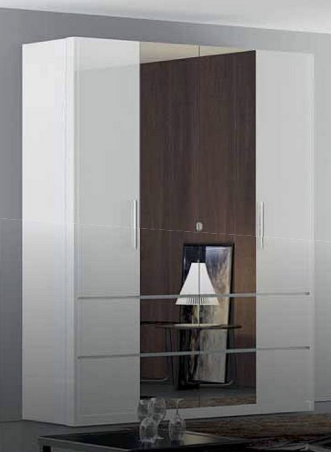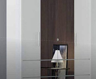 Шкаф в спальню белый Норман имеет четыре двери, посередине расположены два зеркала, внутри полки для хранения и отделение со штангой для вешалок. Изготовлен из МДФ белоснежного оттенка, глянцевые фасады декорированы хромированными вставками.