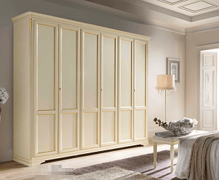 Шкаф в спальню из массива шестидверный Marco Polo очень вместительный и при этом роскошный. Стильный молочный оттенок с резным орнаментом задекорирован сусальным золотом. Большое количество отделений для вещей и штанги для вешалок. Каждая деталь дизайна проработана с особой точностью.