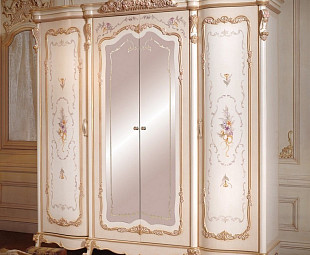 Шкаф в спальню распашной белый Лейла имеет четыре дверцы, две посередине с зеркальной поверхностью. Изготовлен из МДФ белоснежного оттенка, глянцевые фасады покрыты декоративной росписью цветочным орнаментом, дополнительный декор из ППУ с позолотой.