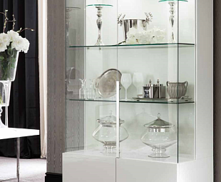 Шкаф витрина белая в гостиную Canova находит идеальное выражение в комнате. Стеклянные двери, возможность приобрести разбирающуюся модификацию или собранную, гармоничная модель в белом глянце с хромированными вставками.
