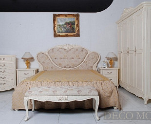 Спальня Анжелина. Мебель спальни сделана из высококачественного мдф в отделке цвета слоновая кость с посеребренными декоративными элементами. В спальне присутствует вся необходимая мебель, кровати, комоды, шкаф, тумба, зеркало, туалетный столик и пуф. Мебель спальни украшают декоративные элементы. Стильная спальня выполнена в классическом стиле, и отлично впишется в интерьер вашего дома.
