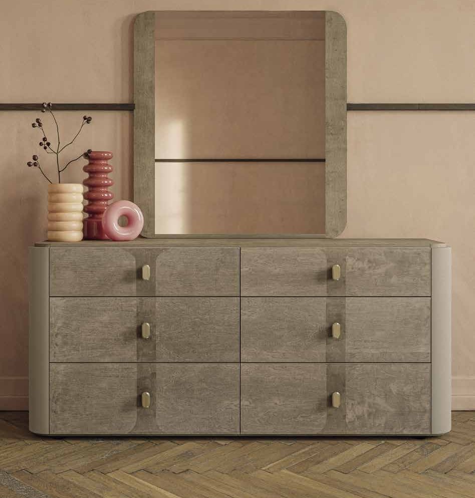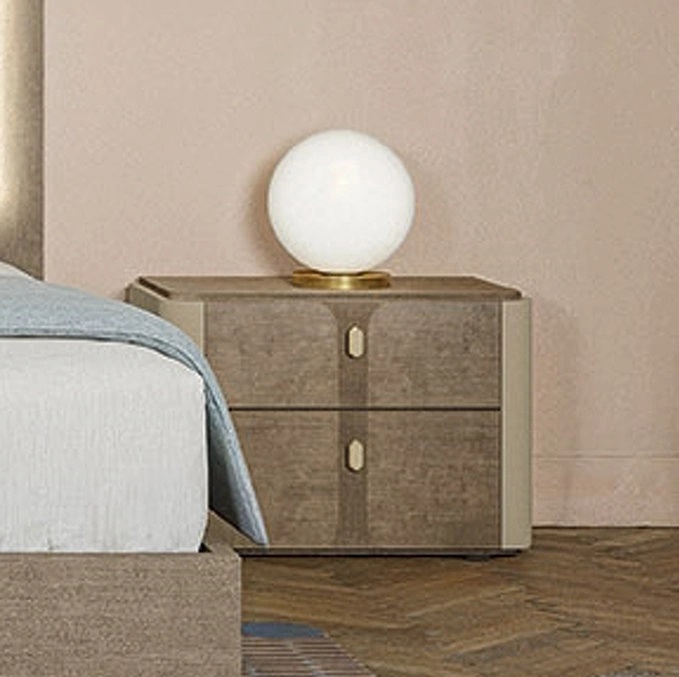 Для создания мебели этой спальни используется отделка с мягкой инкрустацией из березы, которая представлена элегантными вставками на передних фасада тумбочек и комодов. Также, для отделки использована матовая мягкая древесина. Боковые части тумбочек и комодов имеют покрытие лаком цвета умбры. Бесшовное сочетание всех отделочных материалов подчеркивает красоту дерева, что придает предметам глубину и современный оттенок.