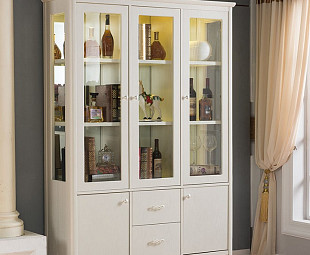 Стеклянная витрина для гостиной Carpenter 309 производится китайской мебельной фабрикой из массива березы, покрытой шпоном ясеня. Трехдверные и четырехдверные модели предназначены для обстановки просторной комнаты.