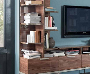 Стеллаж книжный открытый Serena дополнит тумбу под телевизор и организует пространство. Возможна комплектация между собой для формирования шкафа во всю стену. Незакрытые полки сверху и скрытая ниша для хранения снизу. Отделка шпоном дерева Кото в цвете "Вяз ваниль глянцевый" дополнена основанием на ножнах из окрашенного металла.