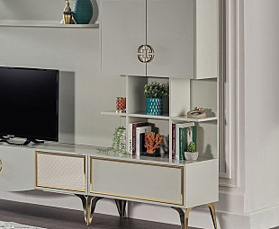 Стеллаж с полками из коллекции Valesco будет прекрасным дополнением к мини-тумбе для телевизора. Позолоченные ручки вместе с обрамлением дверей разнообразят лаконичный вид стенки.