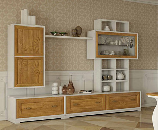 Модульная стенка La Dolce Vita выполнена из массива дерева в двухцветной отделке. Изысканная функциональная модель, представленная в стиле модерн, оснащена трехсекционной напольной тумбой, навесными шкафчиками и открытыми полками. Эстетическая составляющая привнесена изящным растительным узором, запечатленным в росписи и рельефе декора.