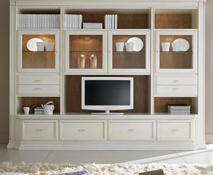 Классическая стенка Margot выполнена в неоклассическом стиле, ставящем на одну ступень строгость, изящество и комфорт. Модель представляет собой роскошный альянс дерева и стекла. Множество полок, отсеков и секций делает ее незаменимым хранилищем всего самого ценного и дорого. В открытых же зонах и за стеклами шкафчиков чудесно устроятся антикварные книги, культовые предметы античности или иные предметы декора, наделяющие образ гостиной эстетической завершенностью.