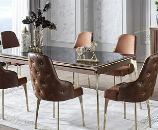 Элегантный стол Montego – это исключительное решение с применением черного мрамора, усыпанного золотистыми прожилками, и изящными ножками в оттенке бронзы. Стол идеально впишется как в интерьер гостиной, так и кухни. Он обеспечивает комфортное размещение от 6 до 8 человек, что делает его прекрасным выбором.