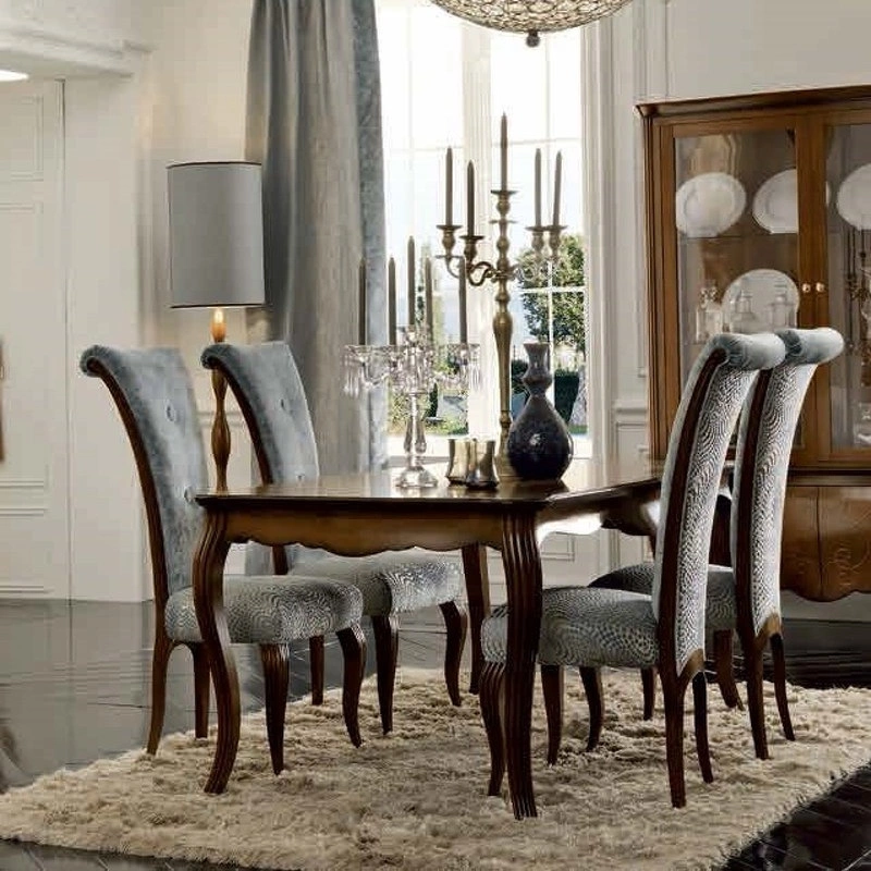 Прямоугольный обеденный стол на изогнутых ножках выполнен в классическом стиле. Декорирован резьбой.