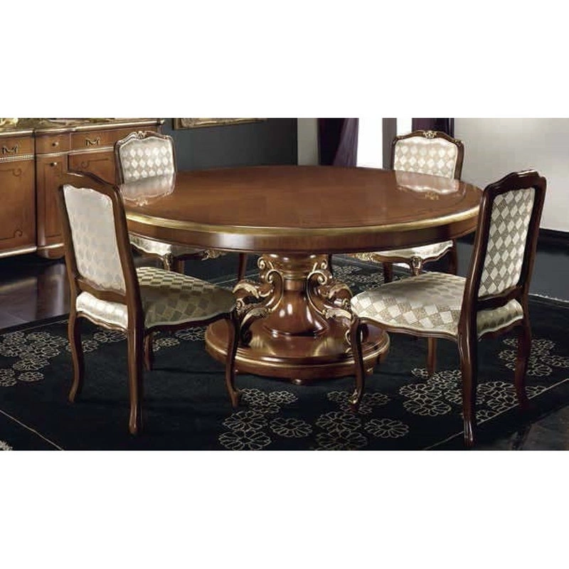 Обеденный стол круглой формы на фигурном основании выполнен в традиционном стиле. Его резные детали подчёркивают оригинальность модели.