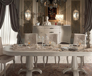 Большой обеденный стол La Belle Epoque, выполненный из цельного дерева, - прекрасный вариант для просторной столовой в классическом стиле. Модель располагает массивными рельефными ножками и фигурной столешницей с раздвижным механизмом.
