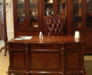 Письменный стол из коллекции Angelina. Солидный письменный стол для кабинета выполнен в классическом стиле, сделан из из массива березы, в отделке из натурального шпона корня оливы. Стол стоит на маленьких резных ножках, имеет дверцы и ящики для хранения вещей. Стол украшен ручной лепкой и красивыми узорами.