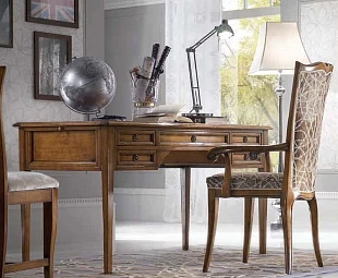 Письменный стол выполнен в классическом стиле. Оснащен пятью выдвижными ящиками.