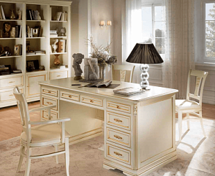 Стол письменный с ящиками Marco Polo гармонично оформит дизайн классического кабинета. Девять вместительных отделений для хранения позволят грамотно распределить в нем все необходимое. Изящный сливочный оттенок дополнен позолоченной фурнитурой и резным орнаментом с сусальным золотом. Всем своим видом этот предмет интерьера отражает роскошь Италии.