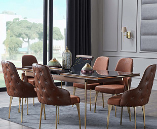 Предлагаемый стол Montego является превосходным примером стиля и функциональности. С его элегантной столешницей из черного мрамора с золотыми прожилками и изящными ножками, этот стол несомненно привлечет внимание в гостиной или кухне. В разложенном виде он имеет размеры 201х100х71, позволяя комфортно разместить от 6 до 8 человек.
