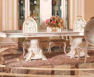 Большой и вместильный, с раздвижным механизмом, увеличивающим его длину на 80 см. Изготовлен из МДФ, столешница лакированная с уникальным рисунком с позолотой и резьбой. Ножки реализованы как колонны с декором из ППУ.