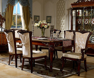 Роскошное исполнение в ореховом цвете из МДФ, столешница глянцевая с имитацией структуры дерева и росписью, резные ножки декорированы объемными элементами ППУ с позолотой. Имеет раздвижной механизм, позволяющий увеличивать размер на 0,4 или 0,8 метра.