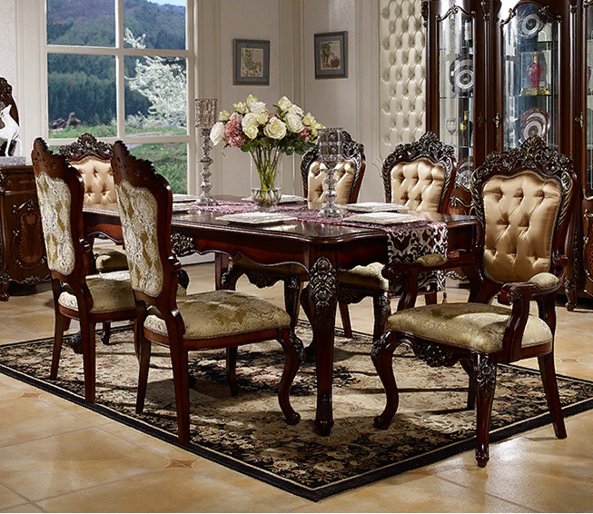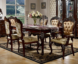 Итальянский стиль исполнения из МДФ в цвете "Орех". Элементы барокко из ППУ с позолотой и ручная роспись на глянцевых фасадах. Имеет специальный механизм, увеличивающий размеры столешницы, на которой явно выделяется текстура дерева.