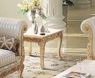 Маленький кофейный столик, богато декорированный различными резными элементами по всему периметру столешницы. Обилие изящных завитков, покрытых патинированным золотом, будут радовать глаз. Тонкие резные ножки спускаются вниз плавной волной, завершая общую идею художника. На выбор можно подобрать множество вариантов материалов и отделки.