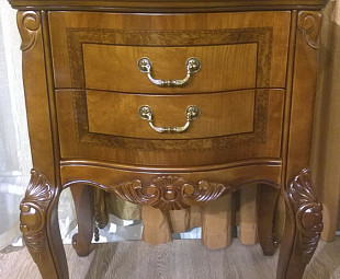 Телефонный столик Angelina от торговой марки Carvelli. Телефонный столик по внешнему виду напоминает прикроватную тумбу, но по мнению итальянских дизайнеров телефонный столик в классическом варианте должен выглядеть именно так. Столик имеет тумбообразную форму с двумя выдвижными ящиками для хранения, стоит на четырех изгибообразных ножках. Столик сделан из массива березы в отделке цвета орех.