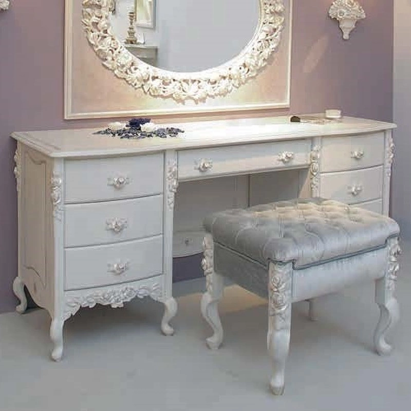 Туалетный столик на изогнутых ножках выполнен в классическом стиле. Декорирован резьбой. Оснащен семью выдвижными ящиками.