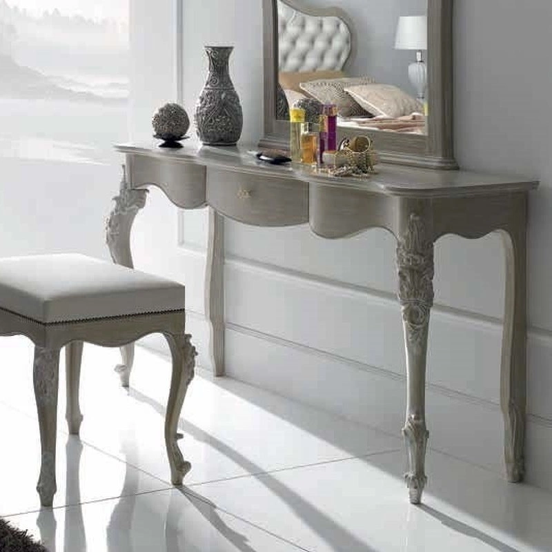 Туалетный столик на изогнутых ножках выполнен в классическом стиле. Декорирован резьбой. Оснащен выдвижным ящиком.